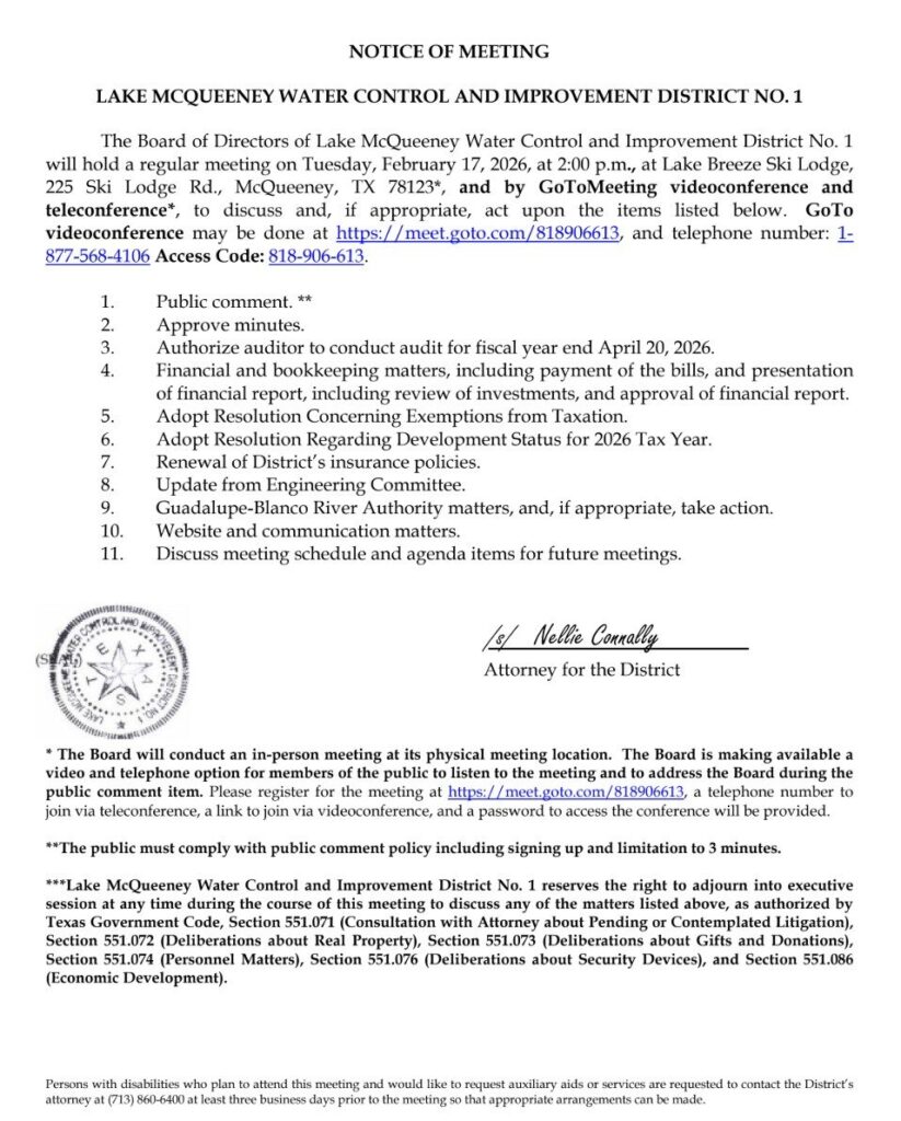The Board of Directors of Lake McQueeney Water Control and Improvement District No. 1 will hold a regular meeting on Tuesday, February 17, 2026, at 2:00 p.m., at Lake Breeze Ski Lodge, 225 Ski Lodge Rd., McQueeney, TX 78123*, and by GoToMeeting videoconference and teleconference*, to discuss and, if appropriate, act upon the items listed below. GoTo videoconference may be done at https://meet.goto.com/818906613, and telephone number: 1- 877-568-4106 Access Code: 818-906-613.